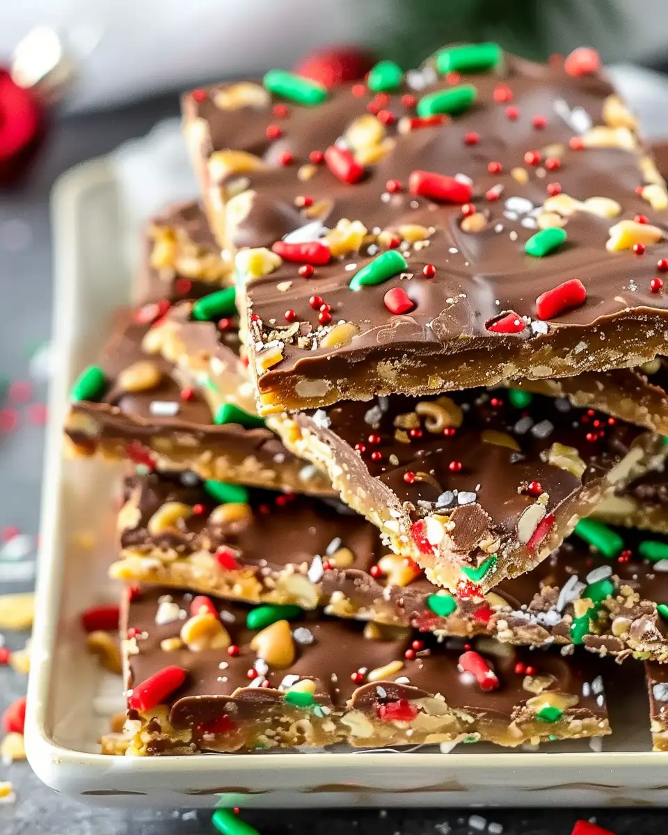 When it comes to showcasing your delicious Christmas crack recipe, presentation can elevate your treat from delightful to spectacular. Consider placing your chocolatey masterpiece on a festive platter lined with parchment paper. If you want to add a sparkle, sprinkle some edible gold dust or crushed candy canes on top; it’s all about the aesthetics! For that personal touch, you could even wrap individual pieces in cellophane and tie them with a ribbon as sweet little treats for guests or coworkers.