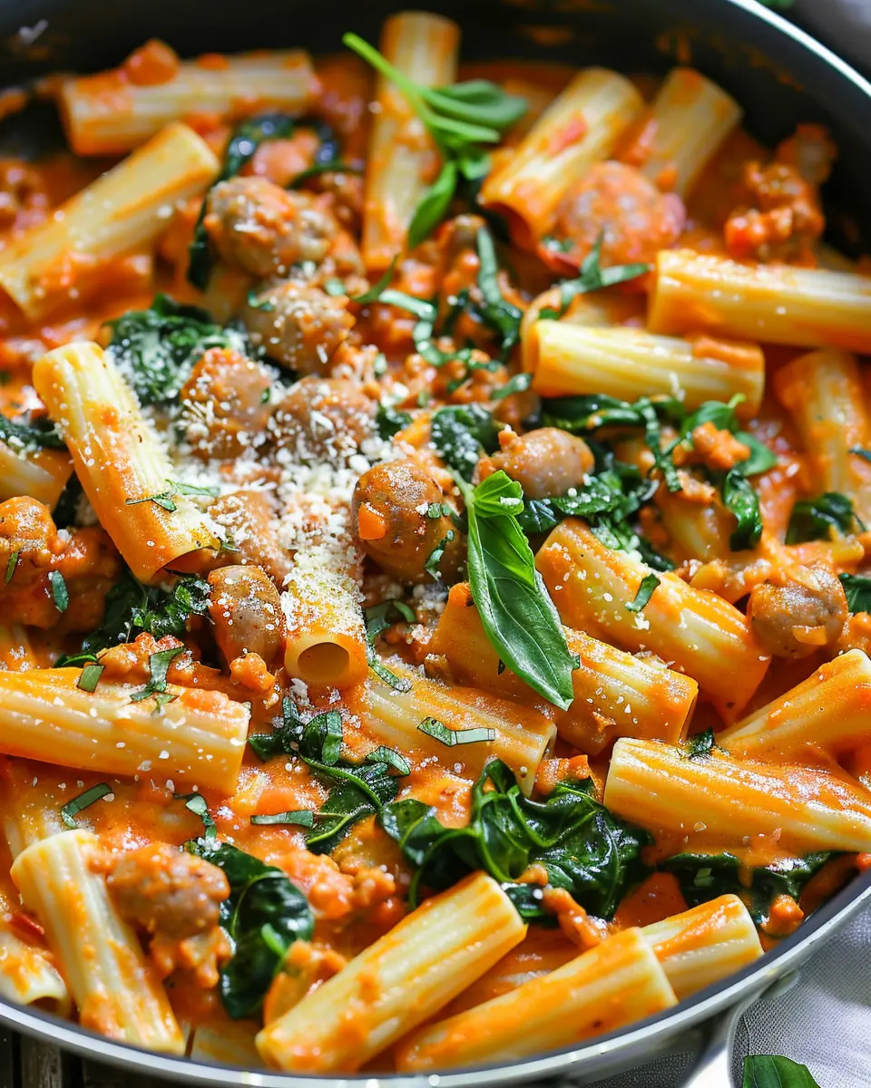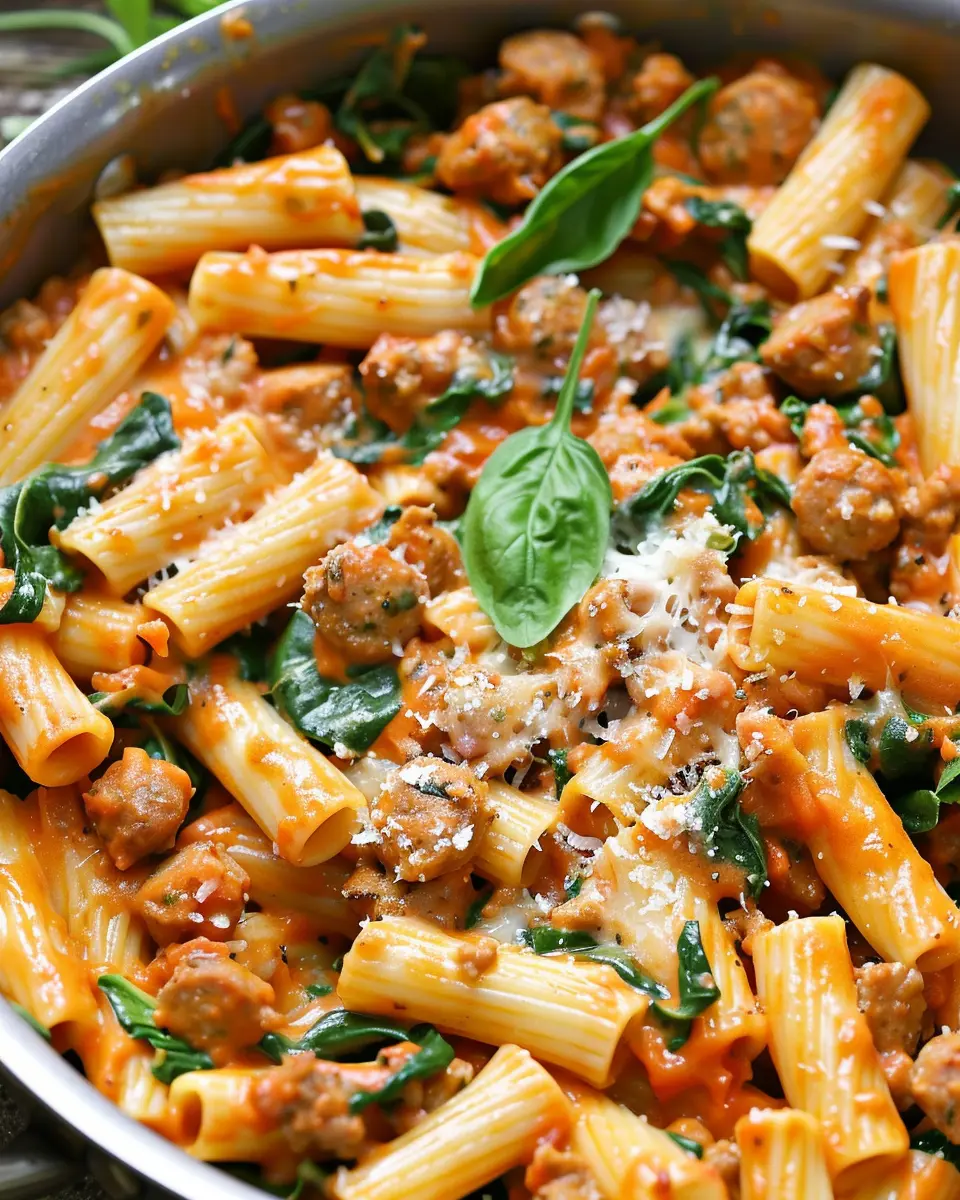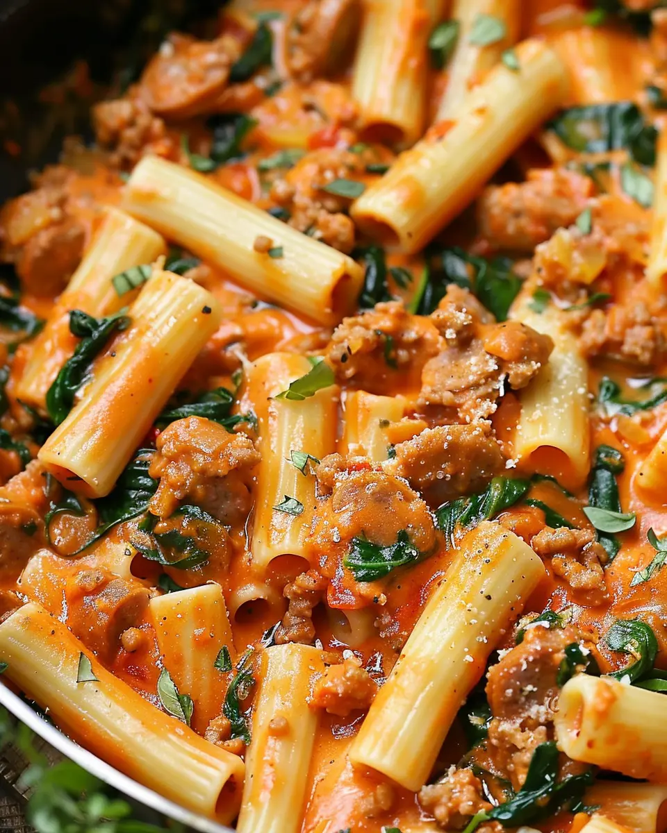 Enjoy this creamy sausage rigatoni dish with spinach, garlic, and a rich tomato cream sauce. Perfect for a quick weeknight dinner!