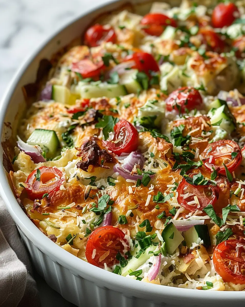 We all have different dietary preferences or restrictions, and this Dump-and-Bake Chicken Tzatziki Casserole is remarkably adaptable. If you’re gluten-free, swap out any bread crumbs for a gluten-free option, or try crushed gluten-free crackers to maintain that delightful crunch. For a lighter protein option, consider using turkey bacon in place of traditional bacon. This swap still provides that savory essence without as many calories.