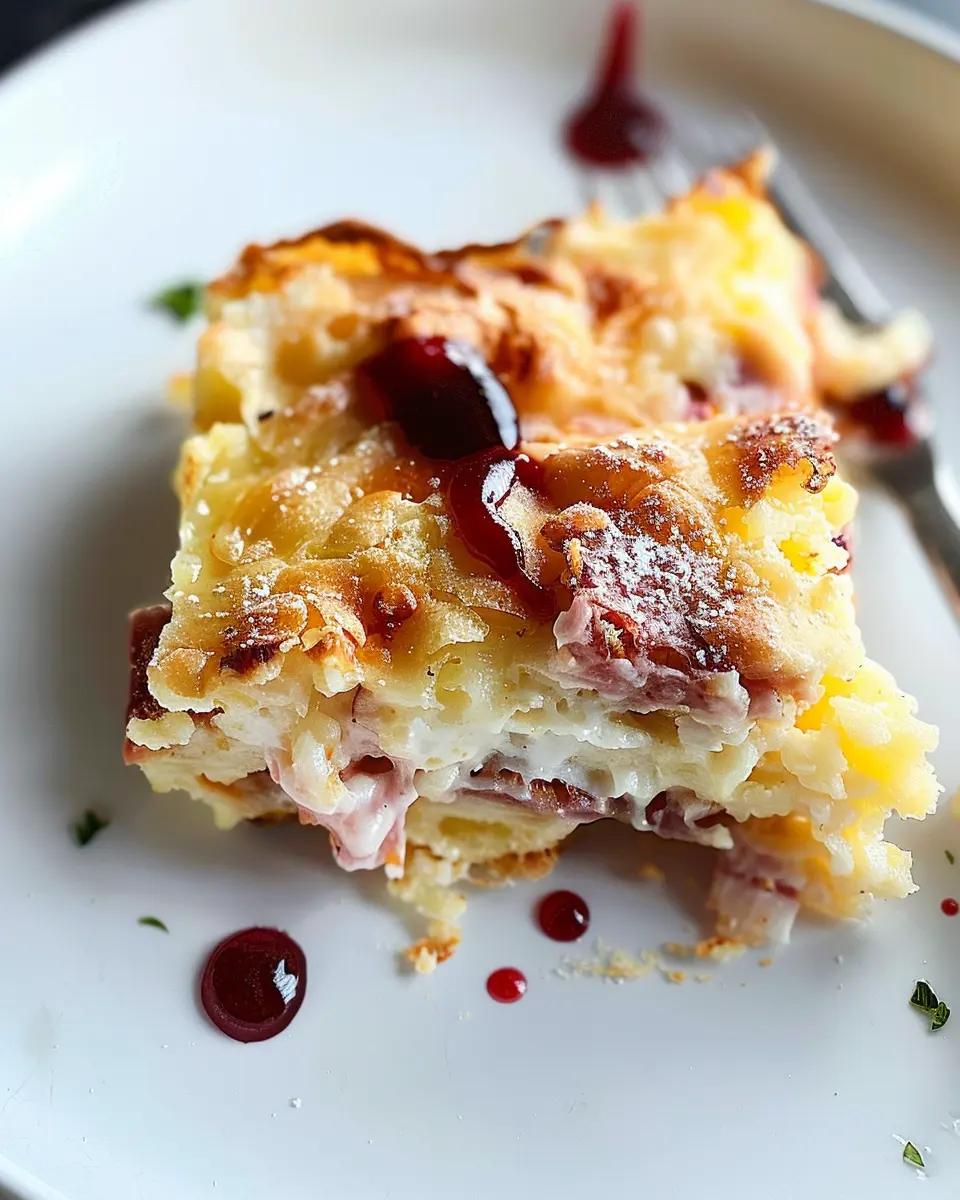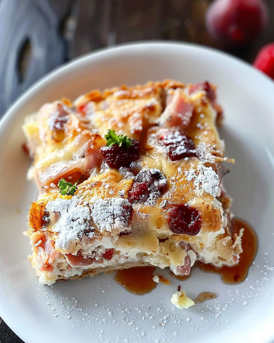 A delicious Monte Cristo Breakfast Casserole that combines turkey bacon and chicken ham for a hearty morning meal.