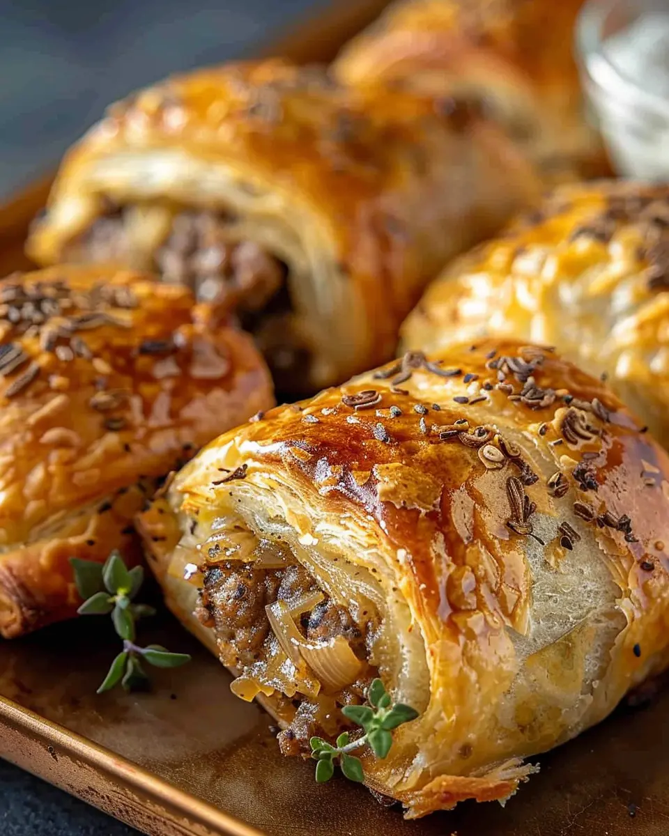 These savory French onion sausage rolls are the perfect appetizer or snack, featuring a golden flaky crust and a flavorful filling.